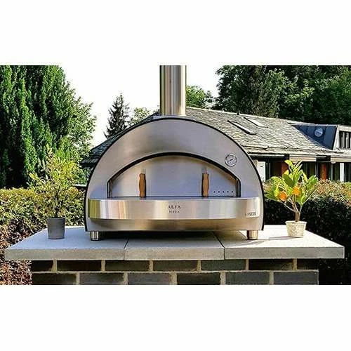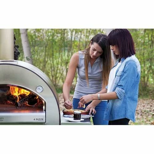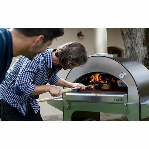 The design and performance of the Alfa 4 Pizze Pizza Oven has everyone talking. It’s Alfa’s worldwide, best-selling oven. Alfa Ovens utilize Forninox Technology that combines the properties of stainless steel with aluminum silicate refractory firebrick to achieve a fuel-efficient and relatively lightweight oven. The stainless steel dome is studied to rapidly reach operating temperature while consuming relatively little fuel. Ceramic fiber insulation maintains long-lasting warmth and helps cut down wood consumption to a minimum. This professional pizza oven features a 743 square inch refractory floor made from interchangeable tiles that are specifically designed to store heat and convey it from the bottom upwards. The dimensions and mouth of the 4 Pizze Oven are ideal to cook 4 pizzas in 90 seconds or 8.8 pounds of bread with every oven load. The wide door fitted with two ergonomic wooden handles allows adjusting the draft inside the oven by controlling the fire.