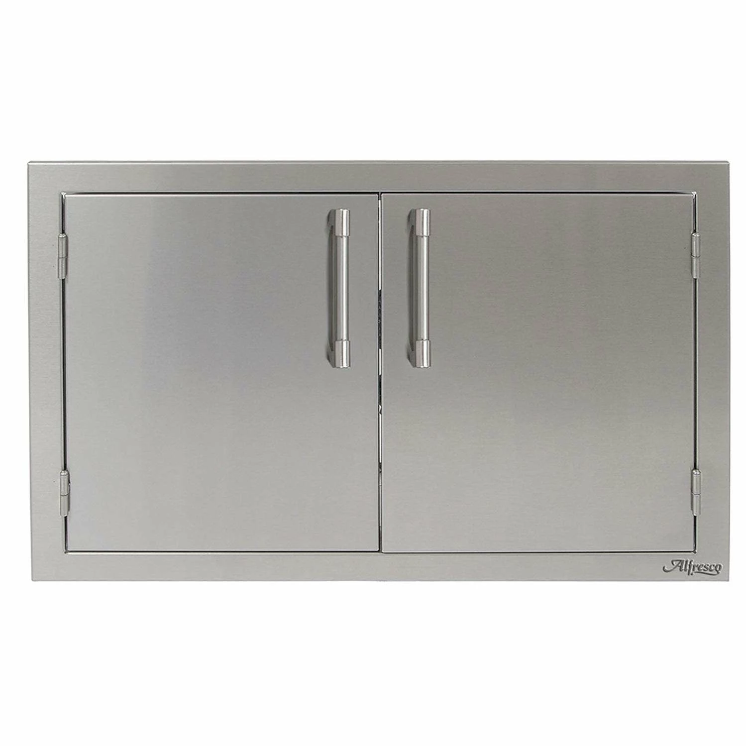 These Alfresco 42-Inch Double Access Doors provide easy and attractive access into your outdoor kitchen island. You can never have too much storage space! The 42-inch door is constructed from 304 grade stainless steel for durability and easy maintenance, offers multiple mounting options, as well as a storage rail inside the door for holding your grilling spices, seasonings and more. AXE model doors feature sleek handles for easy opening. Stamped with the Alfresco logo, you can be assured you are receiving high quality equipment.
