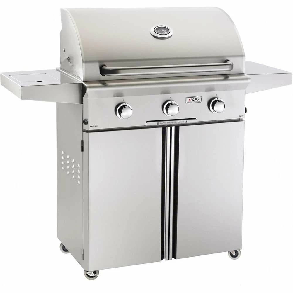 The AOG L Series 30-Inch Freestanding Grill is designed for long-lasting, unsurpassed performance that produces unbelievable flavor. Proudly made in the USA and built to last, this AOG L-Series gas grill features commercial grade 304 series stainless steel construction, long-lasting stainless cooking grids, and heavy-duty warming rack, and highly-sophisticated stainless steel 45,000 BTU U-shaped burners with integrated support posts for performance and durability. An optional flush-mounted brass 12,000 BTU side burner is perfect for preparing sides while you grill your main course. If you enjoy grilling veggies, steaks, and chicken any time you want, the first things you will appreciate are the electronic push-button ignition and brand-new interior halogen lighting – perfect for night grilling and powered by a right-side push button and 120-volt connection. Other great features on this grill include 540 square inches of primary grilling space, stainless steel vaporizer panels (also called flame tamers) for even heat distribution, solid brass valves with black-flared front knobs for precise temperature control and longer life, and a funneled grease management system with slide-out drip tray for painless cleanup. Roast a better bird with the optional high-performance rotisserie kit with a 10,000 BTU infrared back burner. All AOG portable grills ship fully assembled (except side shelves) on large, durable 2 1/2 inch wheels. Alongside the rest of the AOG line, they boast a stylish, sleek appearance, including the beautiful double-layered satin finish hood, stainless steel construction, and custom-designed analog thermometer with polished bezel. Whether you enjoy entertaining the neighbors or rounding up the family for a fresh meal, this AOG 30-inch L-Series gas grill will add style and cooking excellence to compliment your outdoor lifestyle.