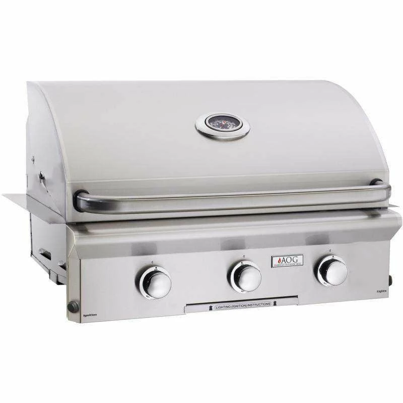 The AOG L Series 30-Inch Grill is designed for long-lasting, unsurpassed performance that produces unbelievable flavor. All AOG built-in grills boast a stylish, sleek appearance, including the beautiful double-layered satin finish hood, stainless steel construction, and custom-designed analog thermometer with polished bezel. Proudly made in the USA and built to last, this AOG L-Series gas grill features commercial grade 304 series stainless steel construction, long-lasting stainless cooking grids and heavy-duty warming rack, and highly-sophisticated stainless steel 45,000 BTU U-shaped burners with integrated support posts for performance and durability. If you enjoy grilling veggies, steaks, and chicken any time you want, the first things you will appreciate are the electronic push button ignition and brand-new interior halogen lighting – perfect for night grilling and powered by a right-side push button and 120 volt connection. Other great features on this grill include 540 square inches of primary grilling space, stainless steel vaporizer panels (also called flame tamers) for even heat distribution, solid brass valves with black-flared front knobs for precise temperature control and longer life, and a funneled grease management system with slide-out drip tray for painless clean up. Roast a better bird with the optional high performance rotisserie kit with 12,000 BTU infrared back burner. Whether you enjoy entertaining the neighbors or rounding up the family for a fresh meal, this AOG 30-inch L-Series gas grill will add style and cooking excellence to compliment your outdoor lifestyle. All Built-In Models available in Natural Gas with Propane conversion kit included.