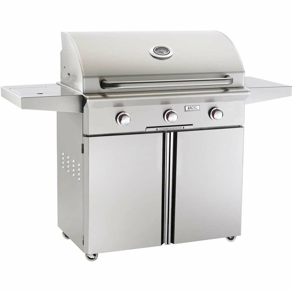 The AOG T Series 36-Inch Freestanding Grill is designed for long-lasting, unsurpassed performance that produces unbelievable flavor. Proudly made in the USA and built to last, this AOG T-Series gas grill features commercial grade 304 series stainless steel construction, long-lasting stainless cooking grids and heavy-duty warming rack, and highly-sophisticated stainless steel 50,000 BTU U-shaped burners with integrated support posts for performance and durability. An optional flush mounted brass 12,000 BTU side burner is perfect for preparing sides while you grill your main course. If you enjoy grilling veggies, steaks, and chicken all year long on an incredible grill, the first thing you will appreciate is the brand-new Piezo Rapid Light ignition, firing you up that much quicker with no electricity or batteries. Other great features on this grill include 648 sq inches of primary grilling space, stainless steel vaporizer panels (also called flame tamers) for even heat distribution, solid brass valves with red-flared front knobs for precise temperature control and longer life, and a funneled grease management system with slide-out drip tray for painless clean up. Roast a better bird with the optional high performance rotisserie kit with 12,000 BTU infrared back burner. All AOG portable grills ship fully-assembled (except side shelves) on large, durable 2 1/2 inch wheels. Alongside the rest of the AOG line, they boast a stylish, sleek appearance, including the beautiful double-layered satin finish hood, stainless steel construction, and custom-designed analog thermometer with polished bezel. Whether you enjoy entertaining the neighbors or rounding up the family for a fresh meal, this AOG 36-inch T-Series gas grill will add style and cooking excellence to compliment your outdoor lifestyle.