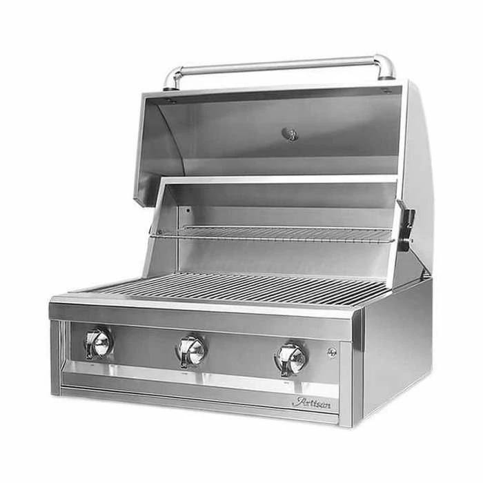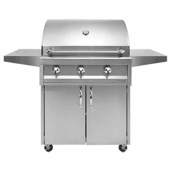 Offering an impressive array of features typically found in more expensive grills, Artisan American Eagle Series grills provides a luxury experience at an affordable price. Built from all 304 series stainless steel for long lasting beauty and resistance to the elements, the Artisan American Eagle 32-Inch Freestanding Grill features a seamless welded double-walled hood with hand-polished accents, a full width handle and an easy-open spring-assisted system. Two stainless steel tube U-burners ensure a long service life, each rated for 20,000 BTUs of powerful heat output. Accurate temperature control is possible thanks to the continuously-variable solid brass control valves, allowing for a wide range of temperatures. A powerful 9v electronic ignition system with heat-resistant encased wiring offers fast, reliable start-up. Durable, stainless steel grill racks ensure long life and easy cleaning, while a dual-position, stainless steel warming rack lifts up and out of the way when not in use for additional work space. Providing protection from the elements and helping maintain the beauty of your grill, the vertical control panel is recessed, keeping chrome knobs and switches out of the way. Experience more comfortable grilling with the unique Artisan air curtain chimney design, keeping controls cool to the touch, even with lid closed. A built-in hood thermometer displays accurate temperatures for easy oven roasting. The matching 304 series stainless steel cart features two side shelves, spacious dual access door storage with chrome handles to match the grill control knobs, and locking caster wheels for ease of mobility.
