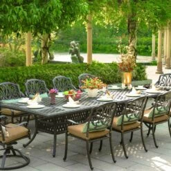 A signature floral elegance defines the Darlee Elisabeth patio furniture collection. An excellent addition to your outdoor seating area, upgrade your patio with this 10-person Darlee Elisabeth 11 Piece Cast Aluminum Patio Dining Set. The cast aluminum frame construction is lighter in weight than wrought iron. The antique bronze frame is powder coated, making it tougher than conventional paint finishes. This Darlee Elisabeth 11 Piece Cast Aluminum Patio Dining Set includes sesame polyester cushions. Dimensions (in inches): Dining Table: 120 W X 46 D X 29 H. Dining Arm Chair: 25 W X 22 D X 36 H. Swivel Rocker Dining Chair: 25 W X 22 D X 36 H. Seat Height: 16. Arm Height: 25.