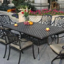 A signature floral elegance defines the Darlee Elisabeth patio furniture collection. An excellent addition to your outdoor seating area, upgrade your patio with this 6-person Darlee Elisabeth 7 Piece Cast Aluminum Patio Dining Set. The cast aluminum frame construction is lighter in weight than wrought iron, and rust resistant. The antique bronze frame is powder coated, making it tougher than conventional paint finishes. This outdoor dining set includes sesame polyester cushions. Dimensions (in inches): Dining Table: 72 W X 42 D X 29 H. Dining Arm Chair: 25 W X 22 D X 36 H. Swivel Rocker Dining Chair: 25 W X 22 D X 36 H. Seat Height: 16. Arm Height: 25.