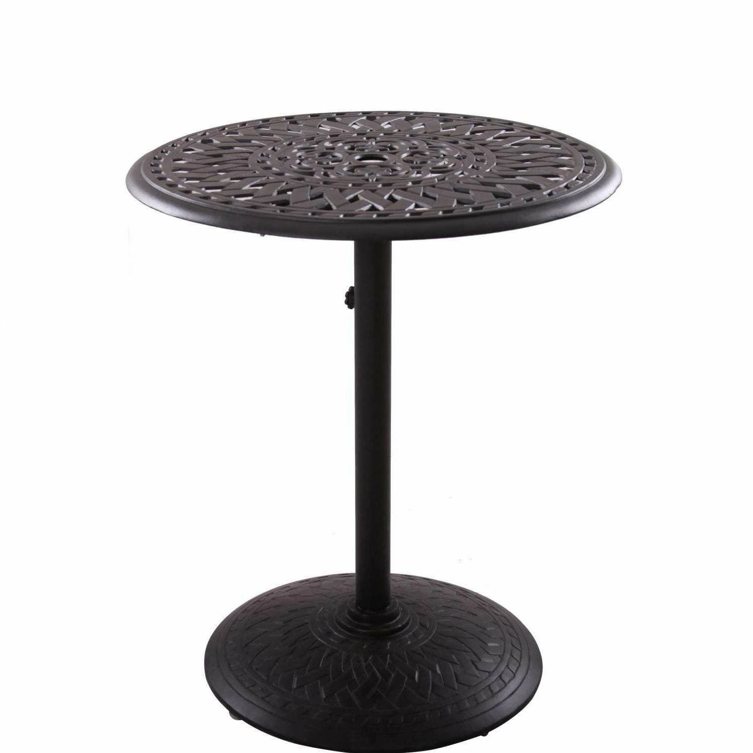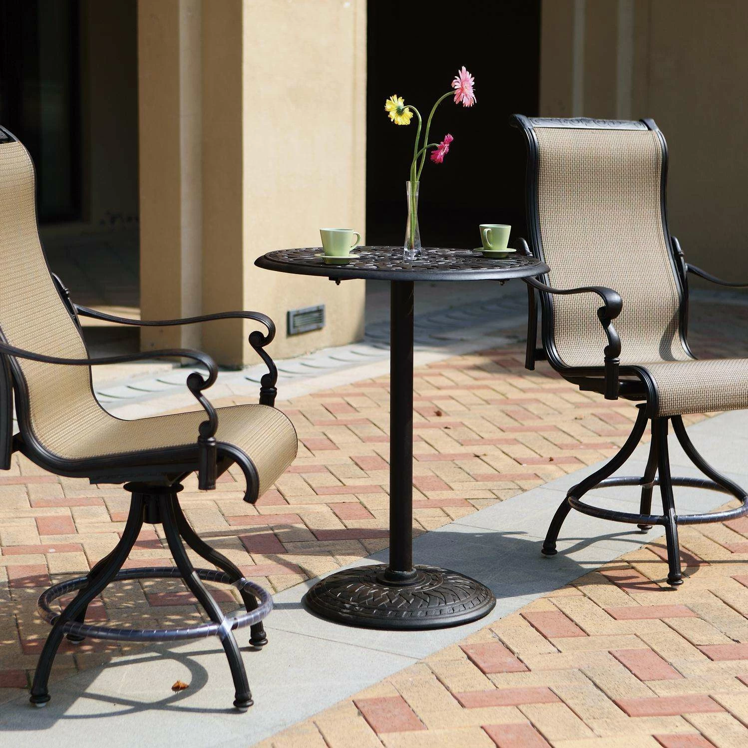 The Darlee Monterey 3 Piece Patio Counter Height Bar Set is an excellent addition to your outdoor seating area, upgrade your patio with this 2-person bar set, which features the distinctive sling styling and unique accents of the Monterey collection. The cast frame is naturally rust resistant. The antique bronze finish is powder coated, making it tougher than conventional paint finishes. Dimensions (in inches): Bar Table: 30 W X 30 D X 34 1/2 H. Counter Height Swivel Bar Stool: 28 W X 29 D X 51 H. Seat Height: 25. Arm Height: 33.