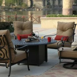 The Darlee Santa Anita 5 Piece Patio Fire Pit Seating Set is an excellent addition to your outdoor seating area, upgrade your patio with this 4-person seating set, which features the signature elegance and curves that are found in the Santa Anita collection. The cast aluminum frame construction is lighter in weight than wrought iron, and is rust resistant. The antique bronze frame is powder coated, making it tougher than conventional paint finishes. The table features a fire pit fed from clean-burning propane gas, for a cozy flame that keeps you warm during the colder seasons. This outdoor patio deep seating fire pit conversation set includes sesame polyester cushions. Add optional fire glass, fire logs or an ice bucket insert for a versatile finishing touch to this unique set. Dimensions (in inches): Fire Pit Chat Table: 52 W X 52 D X 25 1/2 H. Club Chair: 28 1/2 W X 32 1/2 D X 37 H. Swivel Rocker Club Chair: 28 1/2 W X 32 1/2 D X 37 H. Seat Height: 12. Arm Height: 24 1/2.