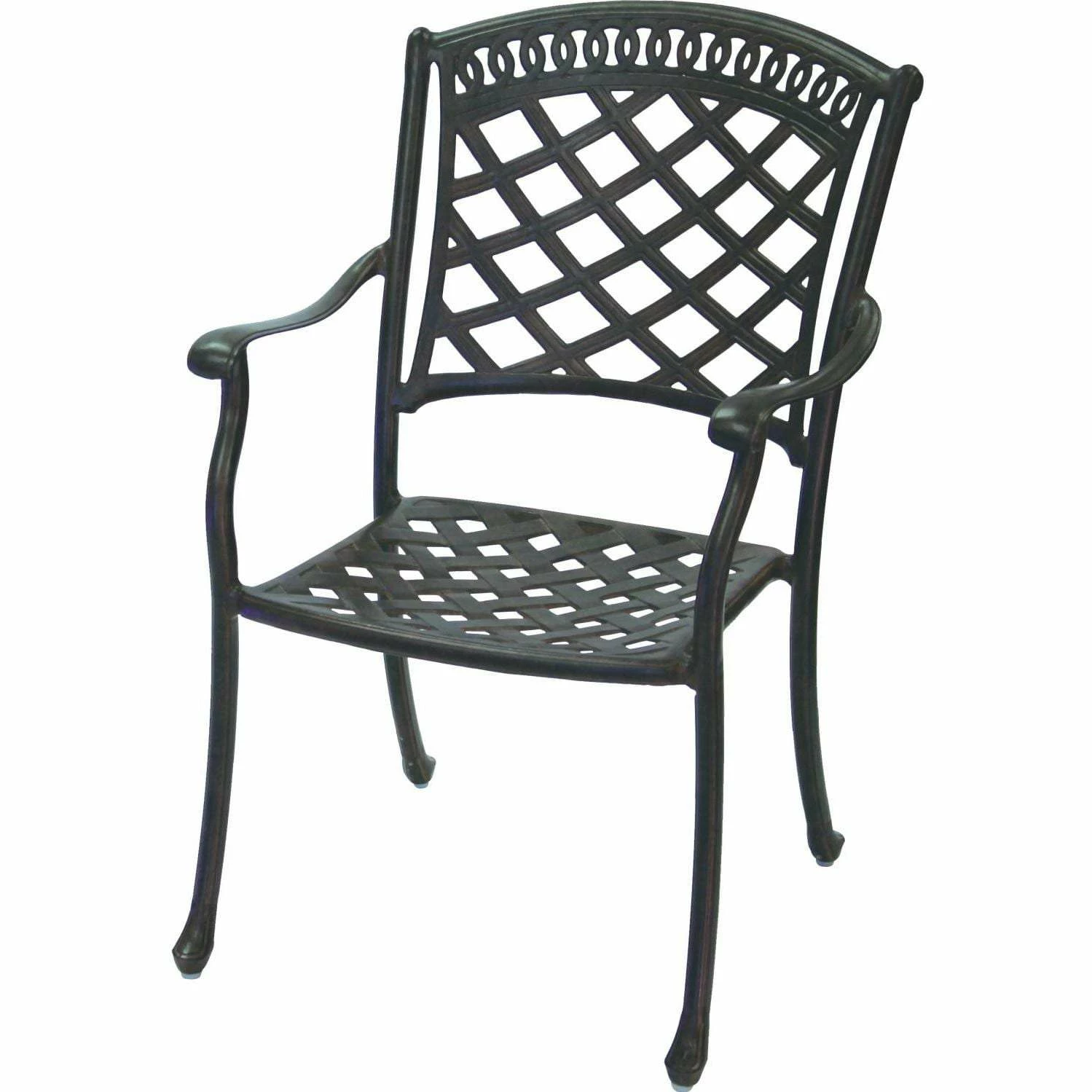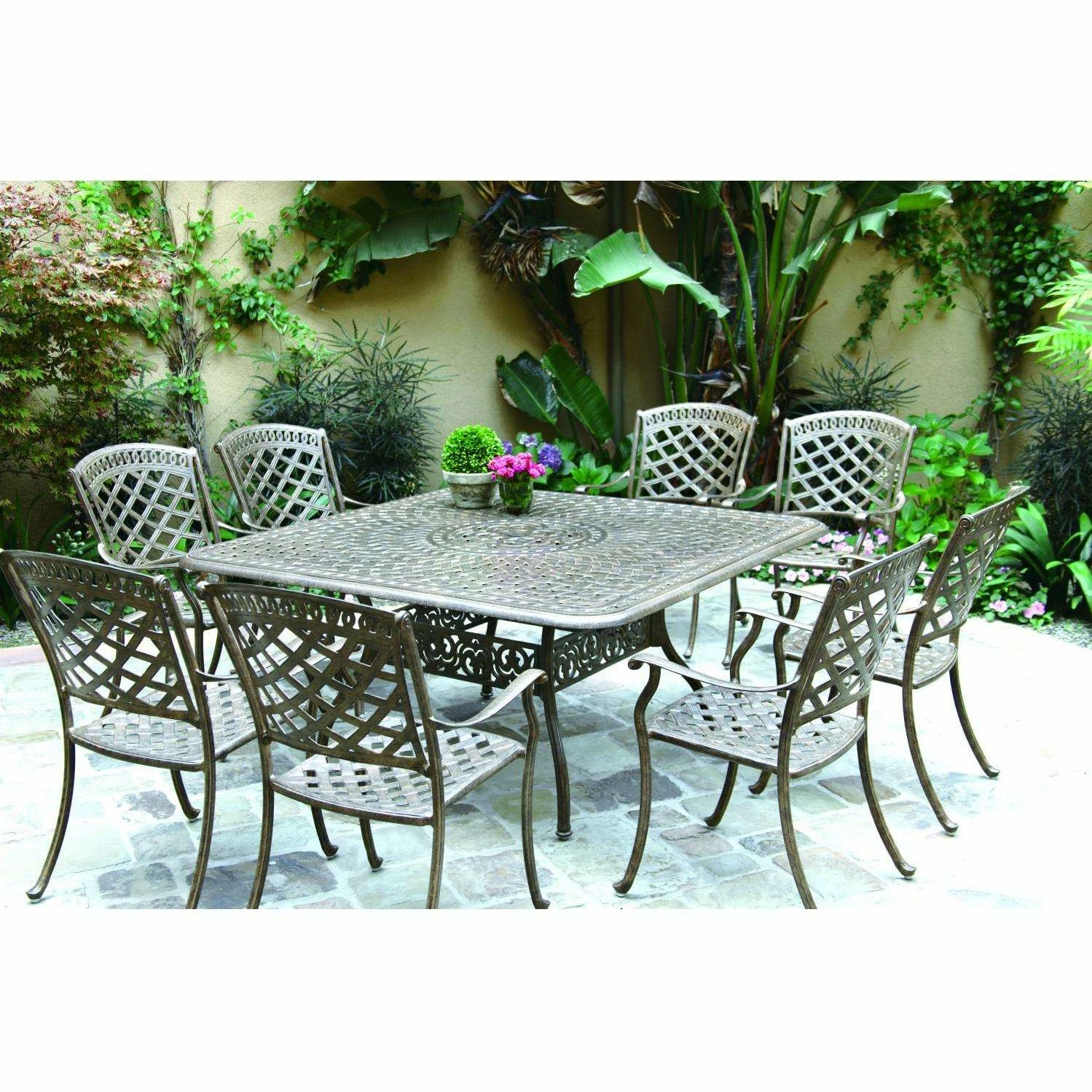 An excellent addition to your outdoor seating area, upgrade your patio with this 8-person Darlee Sedona 9 Piece Cast Aluminum Patio Dining Set, which features the unique accent of the Sedona collection. The cast aluminum frame weighs less than wrought iron, and is naturally rust resistant. The antique bronze finish is powder coated, making it tougher than conventional paint finishes. This outdoor dining set includes sesame-colored polyester cushions. Dimensions (in inches): Dining Table: 60 W X 60 D X 29 H. Dining Arm Chair: 24 1/2 W X 22 1/2 D X 36 H. Seat Height: 16 1/2. Arm Height: 25 1/2.