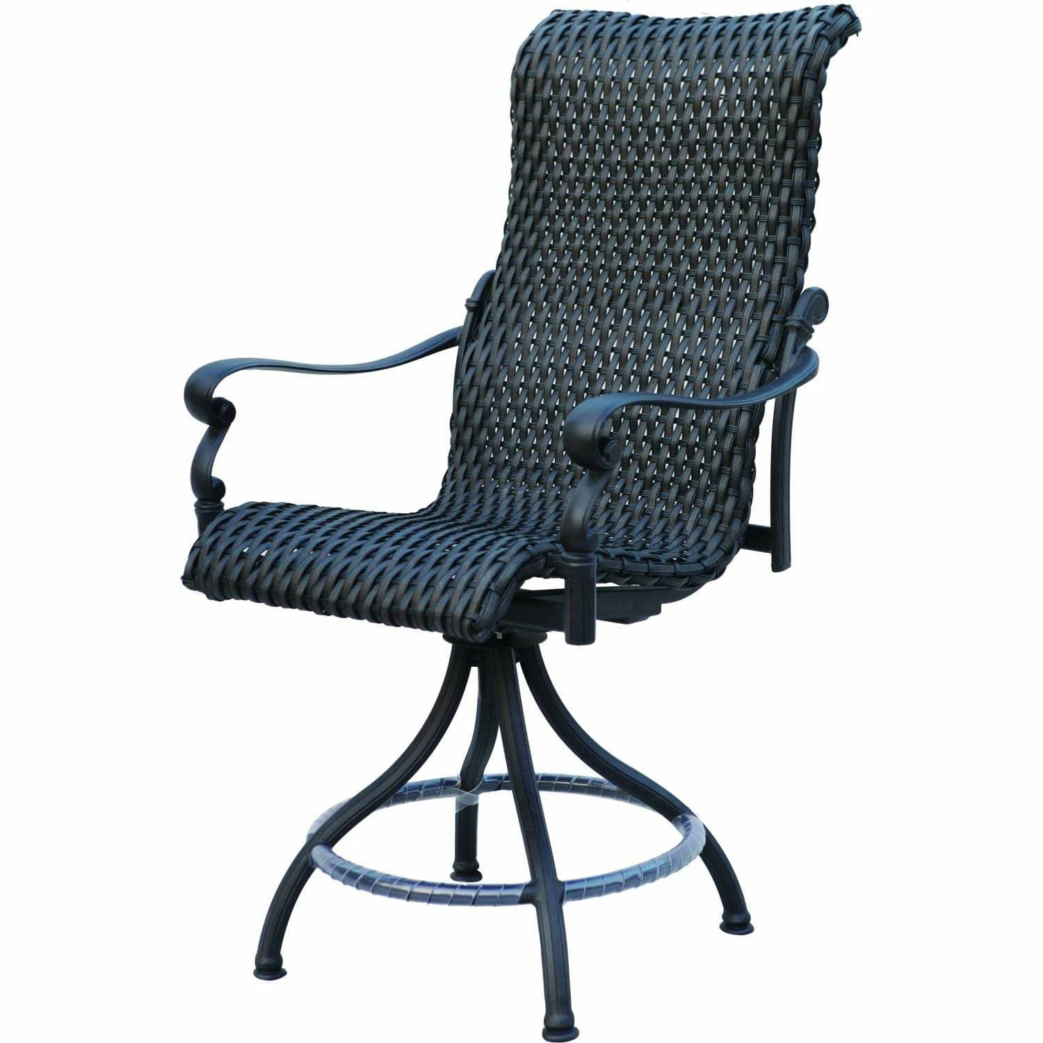 The Darlee Victoria collection combines the durability of cast aluminum with the style of resin wicker. The 8-person Darlee Victoria 9 Piece Resin Wicker Counter Height Patio Dining Set comes with bar stools that have a swivel base for 360 degrees of rotation and a table with an umbrella hole for adding shade. A cast aluminum frame with an all weather resin wicker back and seat is finished in rich espresso. The powder-coated, cast aluminum frames and table are lightweight and naturally rust resistant on this Darlee Victoria 9 Piece Resin Wicker Counter Height Patio Dining Set. UV-treated wicker will not crack or peel like natural wicker and can withstand all weather conditions. Dimensions (in inches): Dining Table: 60 W X 60 D X 35 1/2 H. Counter Height Swivel Bar Stool: 28 W X 29 D X 51 H. Seat Height: 25. Arm Height: 33.