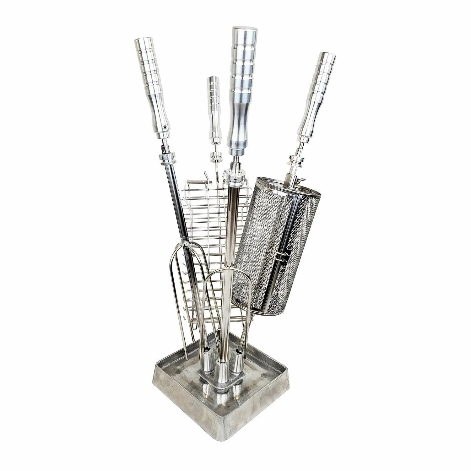 - Each rotisserie includes six Adjustable 304 grade stainless steel skewers with heat resistant CNC milled aluminum handles