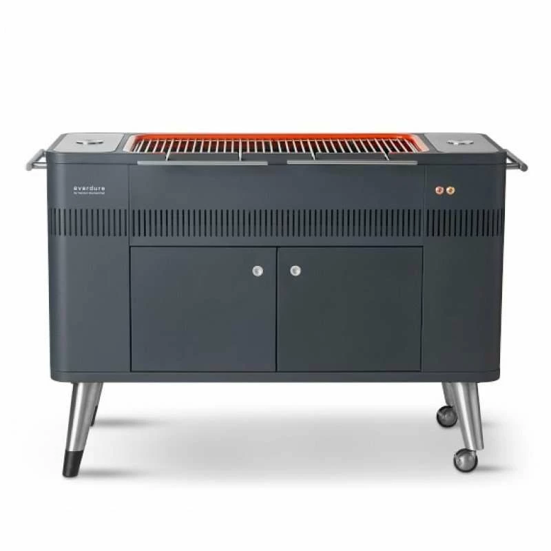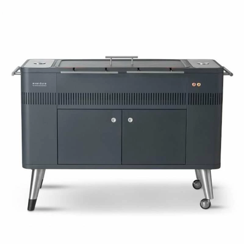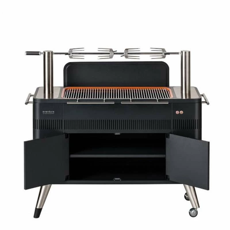 The Everdure Hub Charcoal Grill is the ultimate charcoal experience designed for outdoor entertainers with a flair for performance. Whether firing it up for simple steaks, trying something more ambitious, or going the whole hog with an epic rotisserie, this grill is perfect for outdoor entertainers. The Hub is equipped with the Fast Flame Ignition System that utilizes an electric element, so you can get your charcoal burning at just the right temperature in just 10 minutes. With the patented, retractable Rotiscope Technology, you can set up an authentic, top-of-the-line rotisserie, powered by a discrete motor, in moments. The jaw-like Clip lock Forks ensure everything from chickens to suckling pigs are kept firmly in place on the rotisserie rod as it turns. From the subtly integrated rotisserie to the retractable power cord, the Hub is the perfect balance of function and form, taking design cues from minimalist Danish design. Easy to use and take care of, the porcelain enamel firebox and charcoal tray are easy to maintain after use.