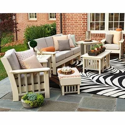 The Finch 7-Piece Mission Conversation Set includes a coffee table, two end tables, two deep seating chairs, and a sofa. Finch handcrafts each piece of their outdoor poly furniture to the highest standards and is made from 97% recycled plastic that is unaffected by termites, rodents, worms, marine parasites, and other insects. Poly lumber is also salt and weather resistant and doesn’t require painting, staining, or other treatment. 316 grade stainless steel fasteners give optimum rust resistance even in salt water exposure. Finch’s unique floating frame design allows normal expansion and contraction needed for poly wood material. Finch outdoor poly furniture is engineered to be weather, decay, discoloring, and mold resistant. In addition to the wide array of colors available, Finch also offers four finishes designed to look like natural wood grain. These include Birch, Driftwood, Walnut, and Antique Mahogany.