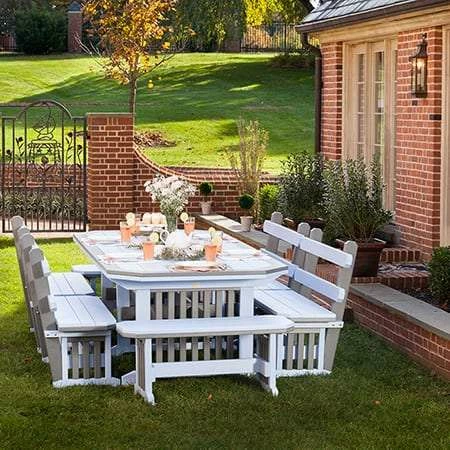 The Finch 7-Piece Mission Dining Set includes a 46 x 96 inch table, four 42 inch backed benches, and two 42 inch benches. Finch handcrafts each piece of their outdoor poly furniture to the highest standards and is made from 97% recycled plastic that is unaffected by termites, rodents, worms, marine parasites, and other insects. Poly lumber is also salt and weather resistant and doesn’t require painting, staining, or other treatment. 316 grade stainless steel fasteners give optimum rust resistance even in salt water exposure. Finch’s unique floating frame design allows normal expansion and contraction needed for poly wood material. Finch outdoor poly furniture is engineered to be weather, decay, discoloring, and mold resistant. In addition to the wide array of colors available, Finch also offers four finishes designed to look like natural wood grain. These include Birch, Driftwood, Walnut, and Antique Mahogany.