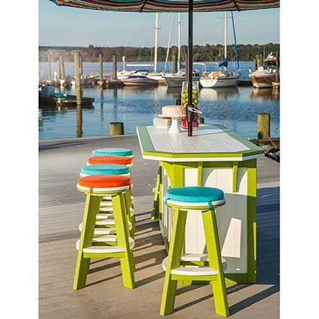 The Finch 8-Piece SummerSide Bar Set includes a 35 x 96 inch bar, six bar stools with cushions, and one 9′ aluminum framed umbrella. Finch handcrafts each piece of their outdoor poly furniture to the highest standards and is made from 97% recycled plastic that is unaffected by termites, rodents, worms, marine parasites, and other insects. Poly lumber is also salt and weather resistant and doesn’t require painting, staining, or other treatment. 316 grade stainless steel fasteners give optimum rust resistance even in salt water exposure. Finch’s unique floating frame design allows normal expansion and contraction needed for poly wood material. Finch outdoor poly furniture is engineered to be weather, decay, discoloring, and mold resistant. In addition to the wide array of colors available, Finch also offers four finishes designed to look like natural wood grain. These include Birch, Driftwood, Walnut, and Antique Mahogany.