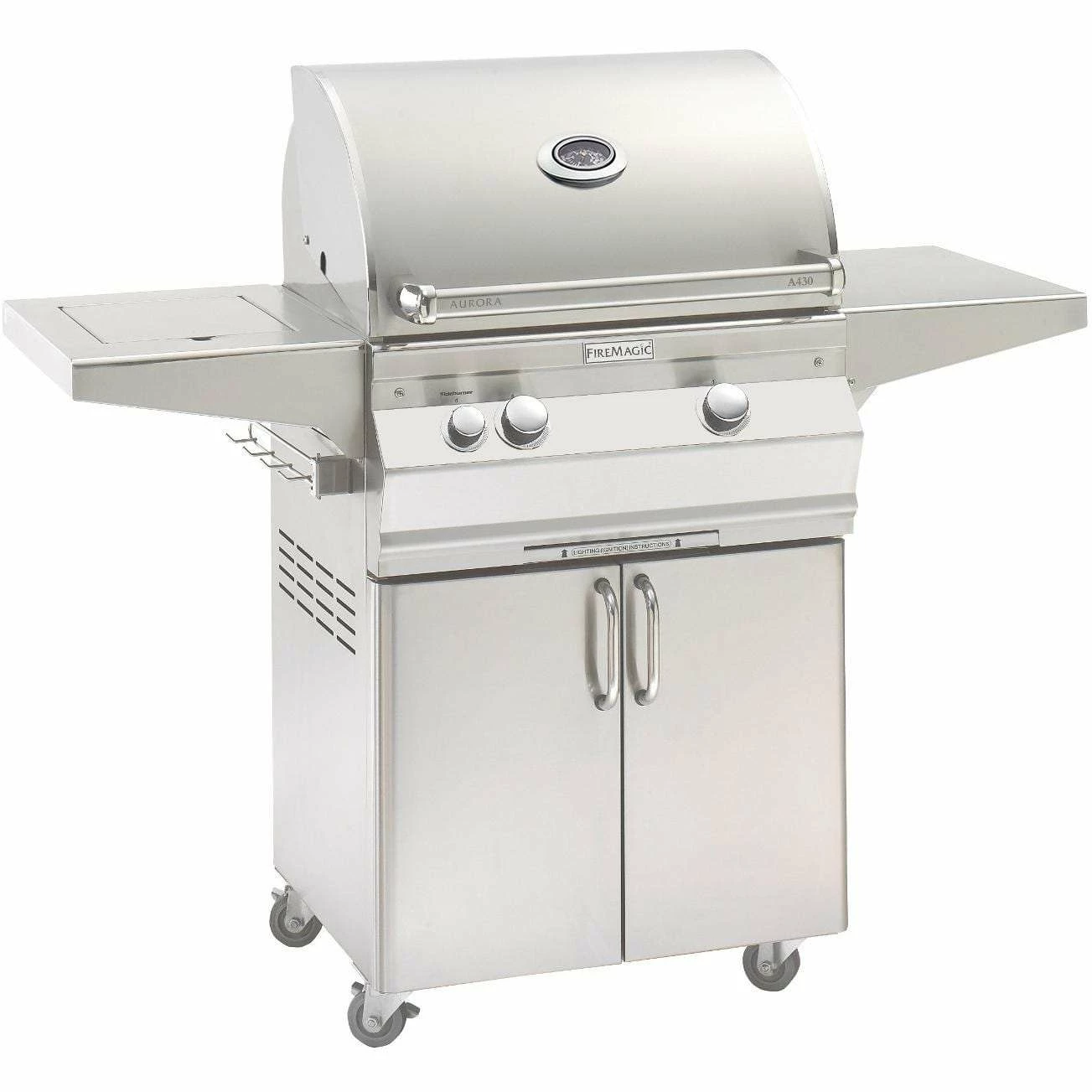 Crafting American-made premium grills for over 75 years, Fire Magic is dedicated to providing you with a quality outdoor cooking experience. From the moment you light your Fire Magic Aurora A430s Freestanding Natural Gas Grill, you know you are on to something great. This 24-Inch Fire Magic built-in gas grill features 304 stainless steel construction for lasting quality, and sleek styling with a seamless control panel and integrated analog thermometer. This Aurora gas grill features a spring-assisted, double-walled tear-drop hood, built-in interior lights, a removable warming rack, a 12V electric hot surface ignition with flash tube back-up and a 12 inch deep firebox for complete convection cooking. Two cast stainless steel E burners produce a total of 50,000 BTUs on the grilling surface, and the 16 gauge, heavy-duty stainless steel cooking grids provide an ample 432 square inches of grilling area while a secondary grid supplies 182 square inches for a total of 614 square inches. Cleaning the Fire Magic Aurora A430s Freestanding Natural Gas Grill is easy with the included grid lifter and the disposable drip pan collection system that is designed to prevent grease pan flare-ups. This grill comes on a stainless steel cart with dual storage doors and two side shelves. The cart includes a single 15,000 BTU side burner flush mounted in one of the side shelves. Also included on the cart is a folding multi-tool holder, folding paper towel holder, propane cylinder tray with latch, and four locking casters. A 120V power source is required.