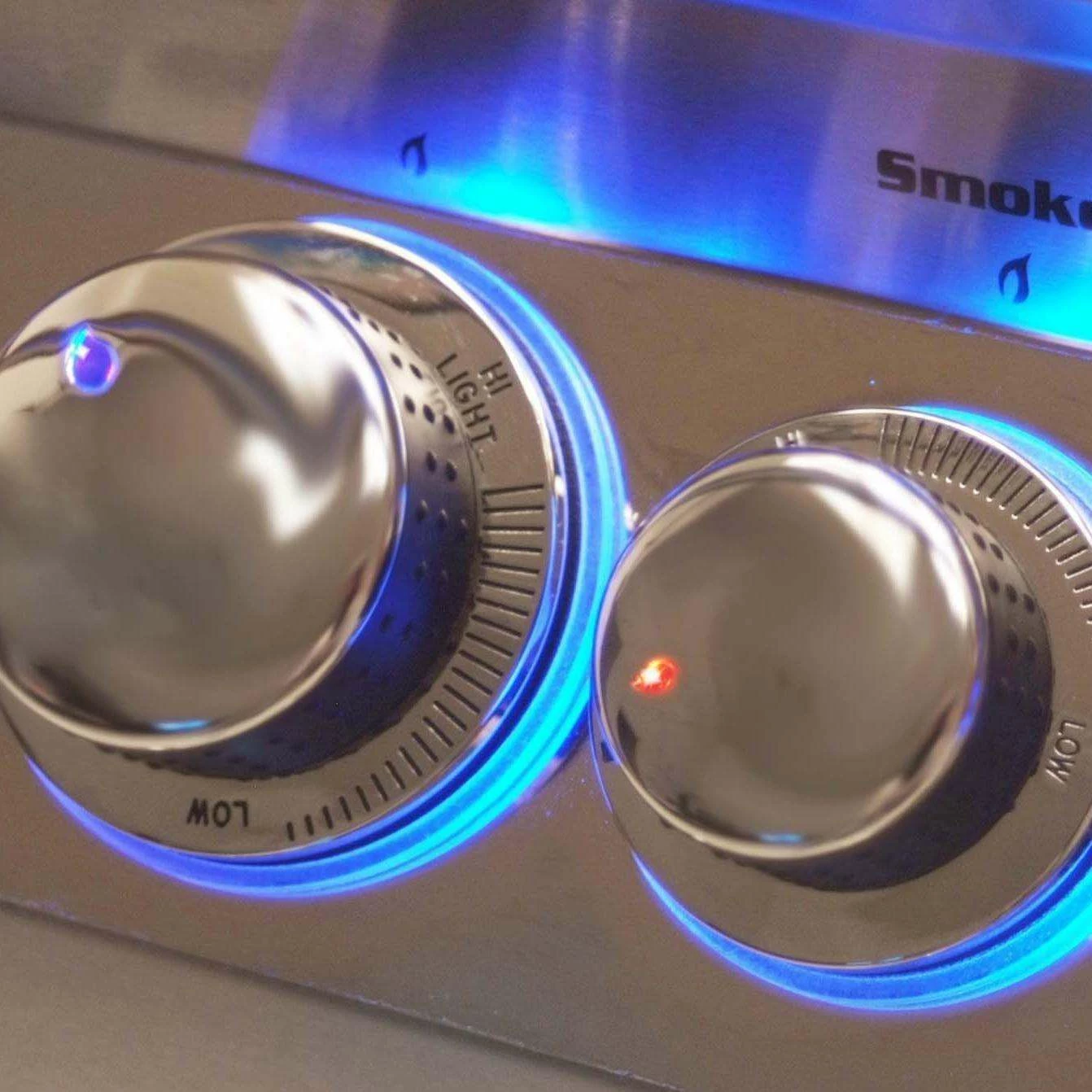 - Blue back lit LED safety knobs and angled internal halogen lights for night time grilling in style