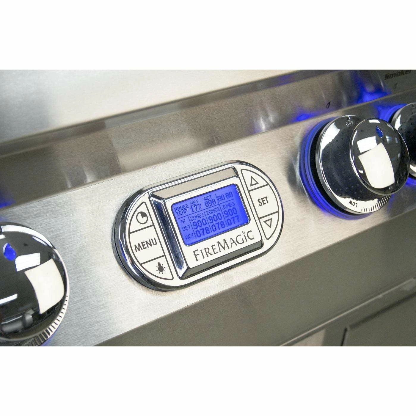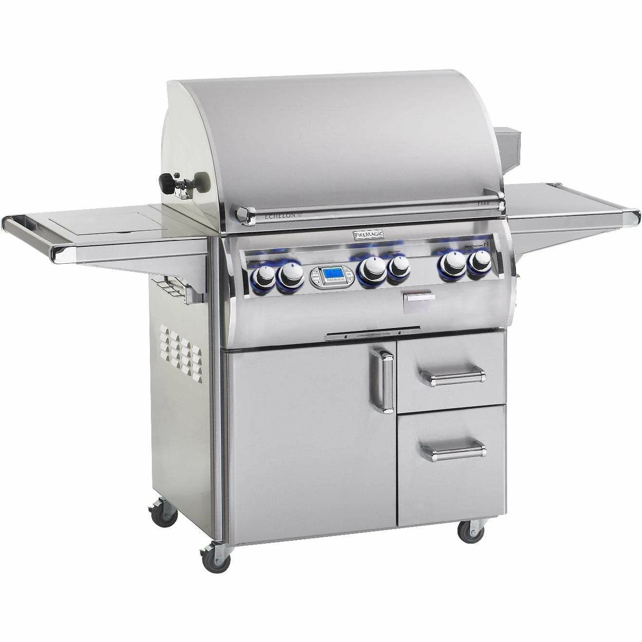 When only the best will do, Fire Magic offers the Echelon Diamond series, combining the ultimate in performance, beauty and innovation. Crafting American-made premium grills for over 75 years, Fire Magic is dedicated to providing their customers with a quality outdoor cooking experience. The Fire Magic Echelon Diamond E660s features 304 stainless steel construction for lasting quality, and modern styling with a sleek, contoured control panel. It comes with a spring-assisted, double-walled tear-drop hood, a removable warming rack, a 12V electric hot surface ignition with flash tube back-up and a 12 inch deep firebox for complete convection cooking. The one main infrared and two main cast stainless steel E burners produce a total of 78,000 BTUs on the grilling surface, and the 16 gauge heavy-duty stainless steel cooking grids provide an ample 660 square inches of grilling area. This grill also features a 11,000 BTU stainless steel Quantum rotisserie burner with kit, which heats up quicker than other rotisserie burners and is designed to direct heat only to the food and not the rest of the grill. The grill also comes with a stainless steel wood chip smoker drawer and dedicated 3,000 BTU burner for adding a smoky flavor to your food. The heat zone separators allow you to cook at different temperatures across the grilling surface, while the integrated premium digital thermometer lets you monitor the temperature of each cooking zone. The thermometer also includes a meat probe, timer and alarms that can set for cooking zone temperature and food temperature. The angled 12V halogen oven lights and back-lit knobs make cooking at night simple and fun. This grill also features rear storage for your rotisserie kit and warming rack when not in use. Cleaning the grill is easy with the included grid lifter and the disposable drip pan collection system that is designed to prevent grease pan flare-ups. This grill comes assembled on a stainless steel cart with dual storage doors, dual storage drawers and two fold down solid shelves with towel bars. The cart includes a 15,000 BTU single side burner flush mounted on one of the shelves. Also included on the cart is a folding multi-tool holder, folding paper towel holder, and four locking casters. The Echelon Diamond requires a 110V power source to work properly and a wiring harness protects wiring from the heat of the grill. Each Echelon Diamond grill comes with a getting started DVD to make using your grill easy and fun.
