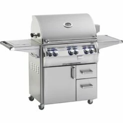 When only the best will do, Fire Magic offers the Echelon Diamond series, combining the ultimate in performance, beauty and innovation. Crafting American-made premium grills for over 75 years, Fire Magic is dedicated to providing their customers with a quality outdoor cooking experience. The Fire Magic Echelon Diamond E790s Propane Gas Grill features 304 stainless steel construction for lasting quality, and modern styling with a sleek, contoured control panel. It comes with a spring-assisted, double-walled tear-drop hood, a removable warming rack, a 12V electric hot surface ignition with flash tube back-up and a 12 inch deep firebox for complete convection cooking. The one main infrared and two main cast stainless steel E burners produce a total of 99,000 BTUs on the grilling surface, and the 16 gauge heavy-duty stainless steel cooking grids provide an ample 792 square inches of grilling area. The Fire Magic Echelon Diamond E790s Propane Gas Grill also features a 13,000 BTU stainless steel Quantum rotisserie burner with rotisserie kit, which heats up quicker than other rotisserie burners and is designed to direct heat only to the food and not the rest of the grill. The grill also comes with a stainless steel wood chip smoker drawer and dedicated 3,000 BTU burner for adding a smoky flavor to your food. The heat zone separators allow you to cook at different temperatures across the grilling surface, while the integrated analog thermometer lets you monitor the temperature of the grill. The angled 12V halogen oven lights and back-lit knobs make cooking at night simple and fun. This grill also features rear storage for your rotisserie kit and warming rack when not in use. Cleaning the grill is easy with the included grid lifter and the disposable drip pan collection system that is designed to prevent grease pan flare-ups. This grill comes assembled on a stainless steel cart with dual storage doors, dual storage drawers and two fold down solid shelves with towel bars. The cart includes a 15,000 BTU single side burner flush mounted on one of the shelves. Also included on the cart is a folding multi-tool holder, folding paper towel holder, propane cylinder tray with latch, and four locking casters. The Echelon Diamond requires a 110V power source to work properly and a wiring harness protects wiring from the heat of the grill. Each Echelon Diamond grill comes with a getting started DVD to make using your grill easy and fun.