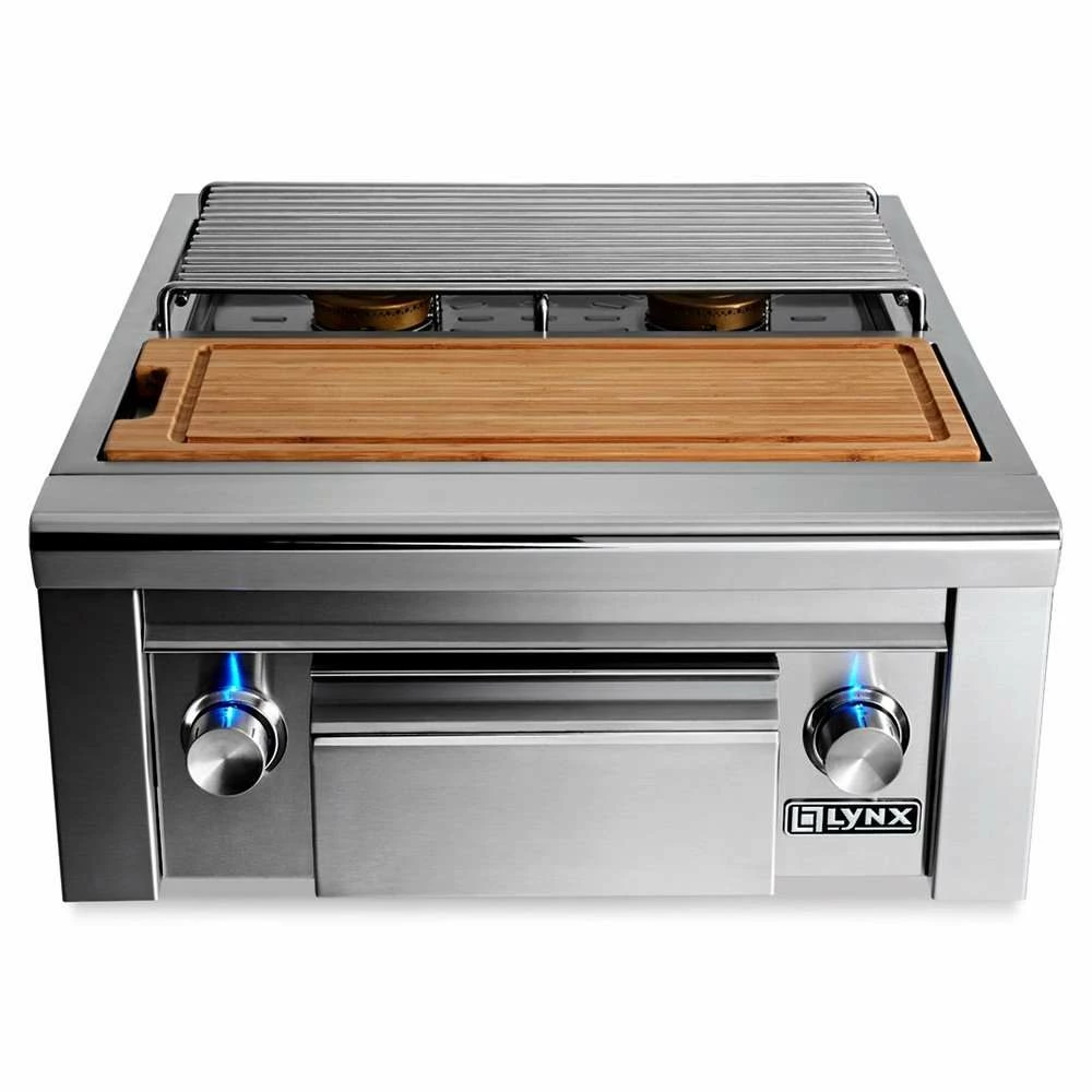 Extraordinary quality and design innovation can be yours with Lynx premium outdoor kitchen accessories. The Lynx Double Side Burner Plus Prep Center features two 15,000 BTU brass burners capable of delivering intense high heat or a low simmer for the perfect cooking conditions every time. The burners and burner basin are sealed making them exceptionally easy to clean and heavy-duty welded construction eliminates gaps where grease and moisture can collect. This unique side burner features an integrated maple cutting board creating a convenient prep area and an extended depth utility drawer for utensil and condiment storage. Reliable lighting with the Lynx Glow coil ignition. This item is designed to plug in to a Lynx Grill in order to provide power for lights and glow coil ignition. Bring the power and performance of Lynx innovation to your outdoor kitchen with the LSB2PC-1 Built-In Side Burner With Prep Center.