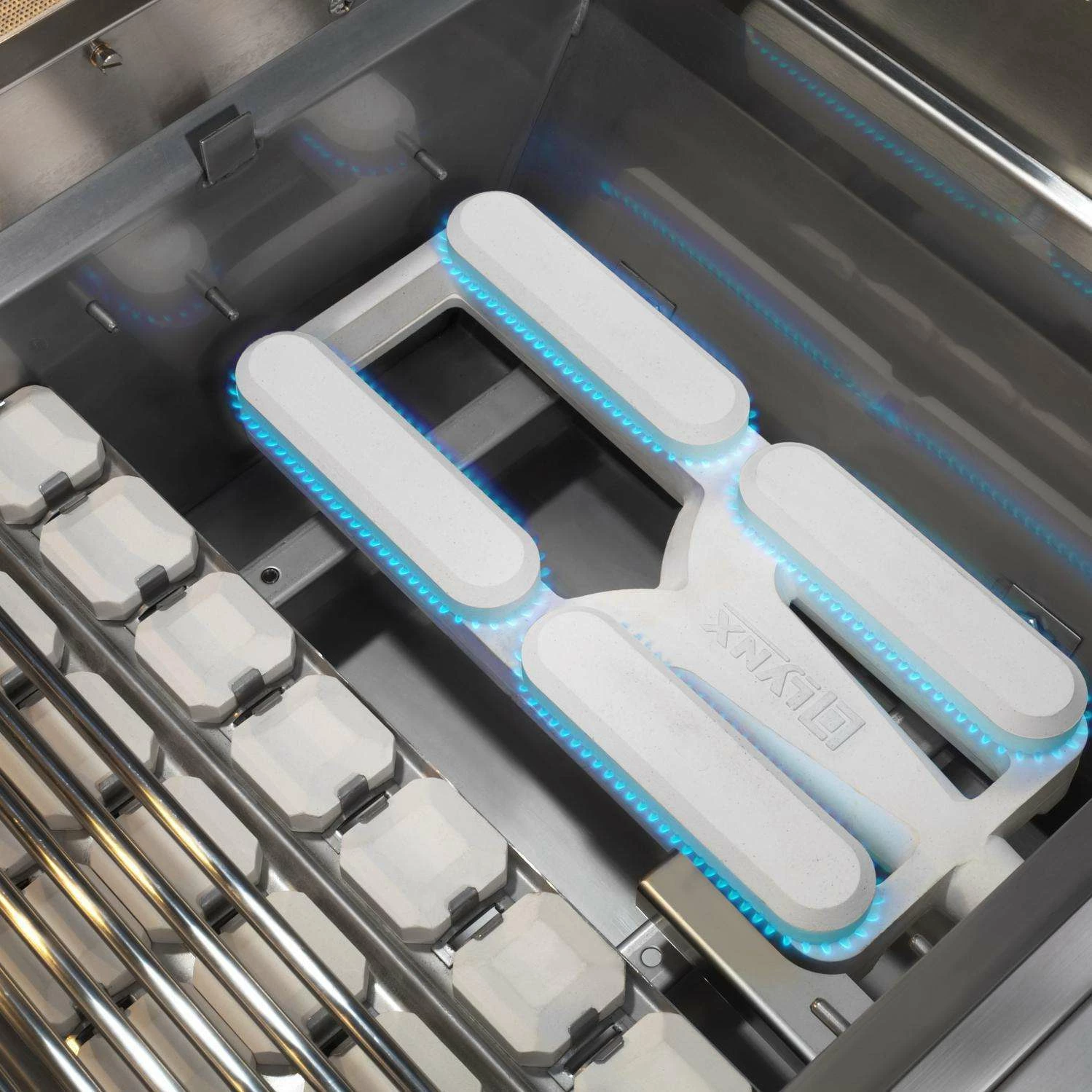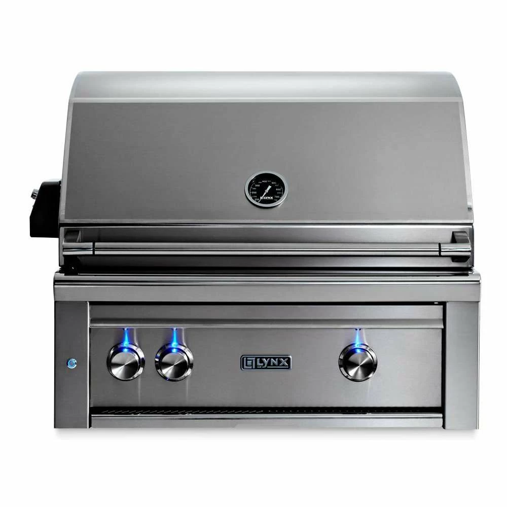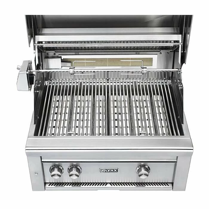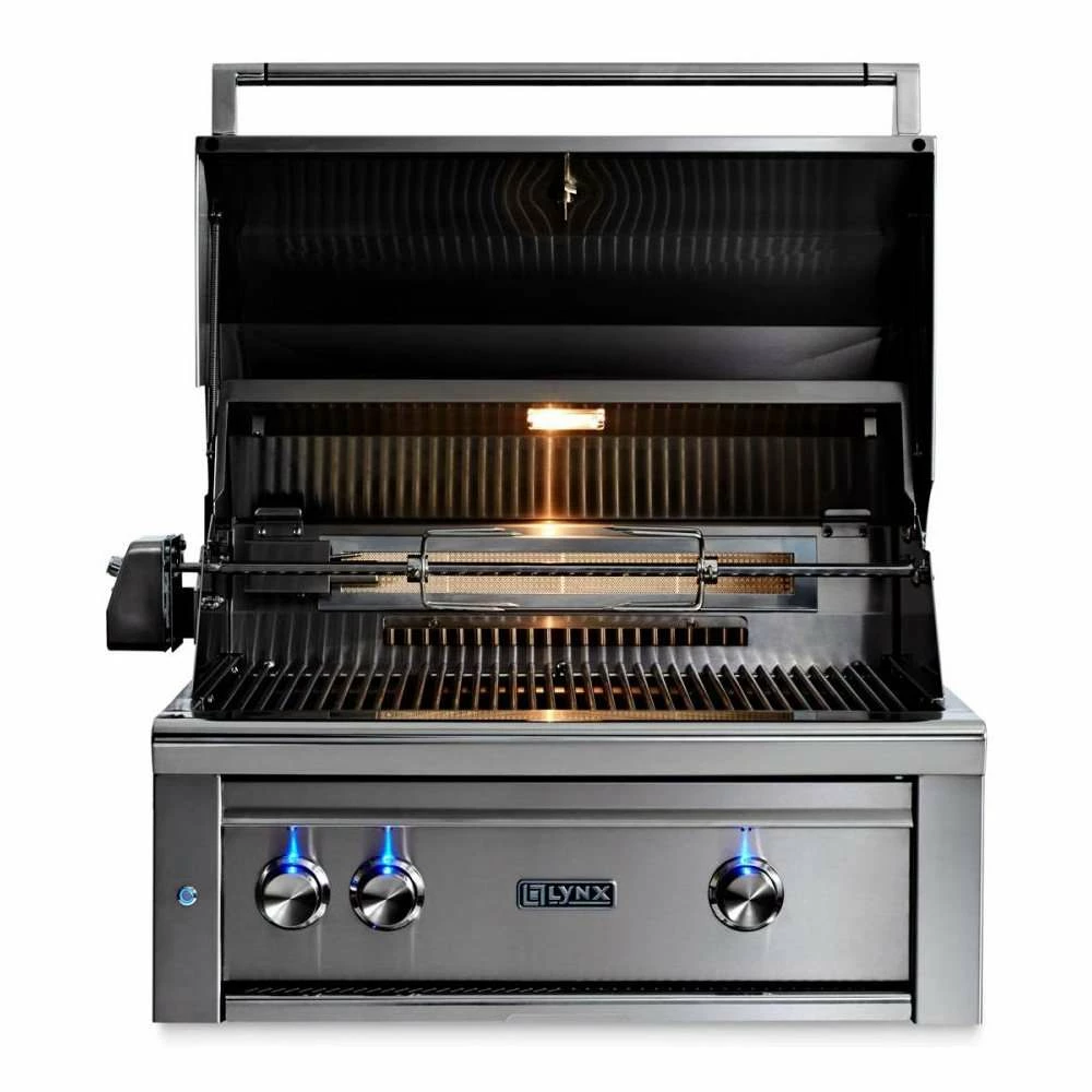 Enjoy the unparalleled outdoor cooking performance with the superior craftsmanship and innovative features found in this Lynx Professional 30-Inch Grill with Rotisserie. The quality begins on the outside with gleaming, high-grade 304 stainless steel that is seamlessly welded to eliminate areas where grease and moisture can collect. A patented design deflects wind and allows the grill to vent properly, stabilizing critical surface temperatures when cooking in windy conditions. Inside, two 25,000 BTU ceramic burners deliver superior heat retention compared to tube burners, so checking progress has minimal impact on cooking performance. The two burners push 50,000 BTUs of total cooking power on the grilling surface. An array of fixed position ceramic briquettes ensures precise, even heat distribution and an advanced ignition system use a hot element positioned directly above the burner port to ignite the burner quickly and safely. A 600 square-Inch main cooking grid combines with a 240 square-Inch secondary grid for a comprehensive 840 square inches of overall cooking area and a large capacity smoker box allows you to add extraordinary flavor to all the things you like to grill. The Lynx Professional Series also comes equipped with a dual-position internal rotisserie with a heavy-duty, 3-speed motor and rear infrared burner to raise your cooking options to their full potential. Lynx made sure you have easy access to all these fine cooking features by adding lift assist and a handle that rotates fluidly as you raise and lower the hood. Like to grill into the night? The adjustment knobs on the control panel sport blue LED accent lights for precise control and ultra-bright internal halogen lights illuminate the grilling surface eliminating guesswork. Bring the power and performance of Lynx innovation to your outdoor kitchen with this Lynx Professional Built-in Gas Grill.