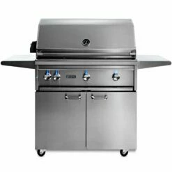 Enjoy the unparalleled outdoor cooking performance with the superior craftsmanship and innovative features found in this Lynx Professional 36-Inch Freestanding Grill. The quality begins outside with gleaming, high-grade 304 stainless steel that is seamlessly welded to eliminate areas where grease and moisture can collect. A patented design deflects wind and allows the grill to vent properly, stabilizing critical surface temperatures when cooking in windy conditions. Inside, a 23,000 BTU Lynx Trident adjustable infrared burner allows you to sear thick-cuts perfectly, or throttle back to cook more delicate items. Two 25,000 BTU ceramic burners deliver superior heat retention over tube burners so checking progress has minimal impact on cooking performance. The three burners push 73,000 BTUs of total cooking power on the grilling surface. An array of fixed position ceramic briquettes ensures precise, even heat distribution, and an advanced ignition system use a hot element positioned directly above the burner port to ignite the burner quickly and safely. A 640 square-Inch main cooking grid combines with a 295 square-Inch secondary grid for a comprehensive 935 square inches of overall cooking area and a large capacity smoker box allows you to add extraordinary flavor to all the things you like to grill. The Lynx Professional 36-Inch Freestanding Grill is also equipped with a dual-position internal rotisserie with a heavy-duty, 3-speed motor and rear infrared burner to raise your cooking options to their full potential. Lynx made sure you have easy access to all these fine cooking features by adding lift assist and a handle that rotates fluidly as you raise and lower the hood. Like to grill into the night? The adjustment knobs on the control panel sport blue LED accent lights for precise control and ultra-bright internal halogen lights illuminate the grilling surface eliminating guesswork. This Lynx grill on cart serves as a complete mobile outdoor kitchen with two heavy-duty swing-out cart doors, magnetic latches, and condiment shelves that are removable for easy cleaning. Commercial-grade casters make the unit easy to move and shelves can be folded down out of the way. Bring the power and performance of Lynx innovation to your outdoor kitchen with this L36TRF Freestanding Gas Grill.