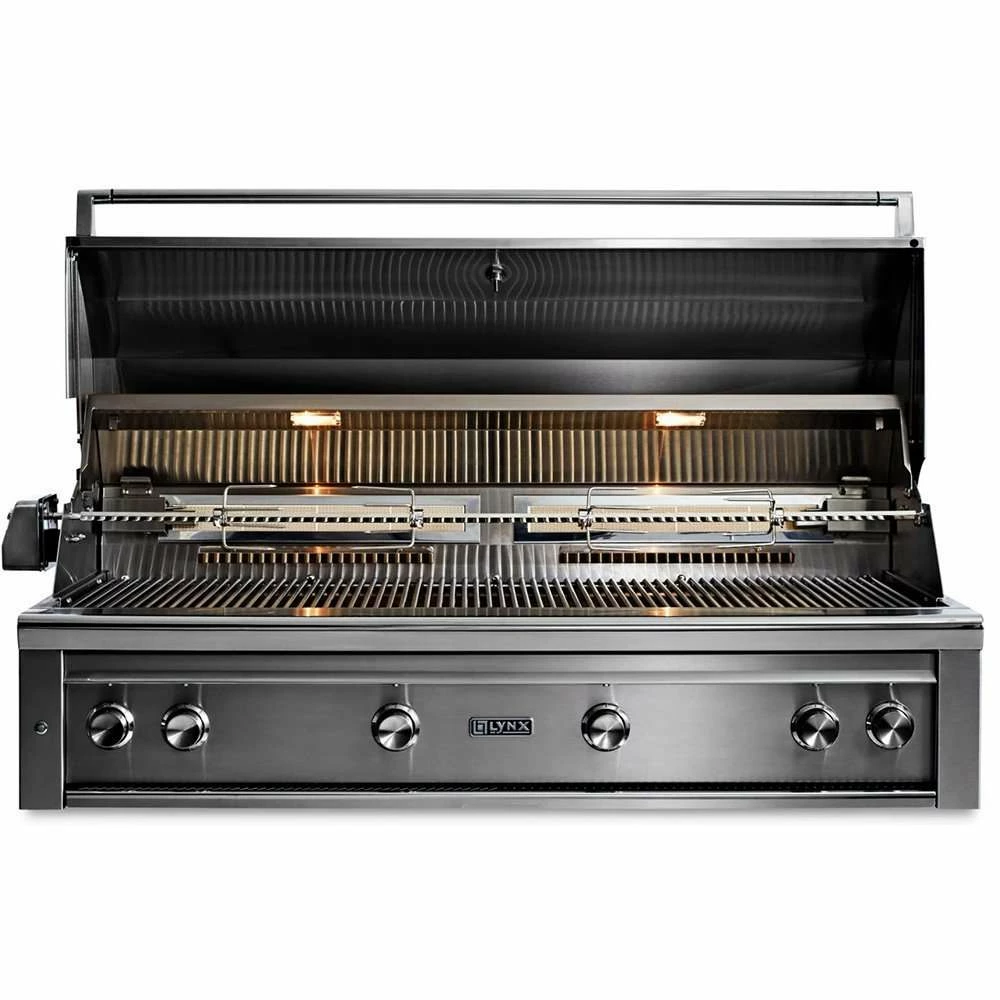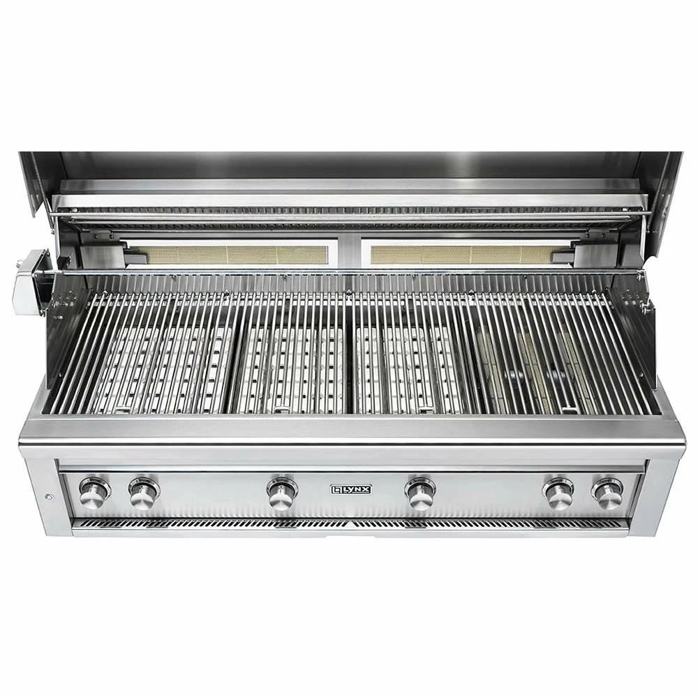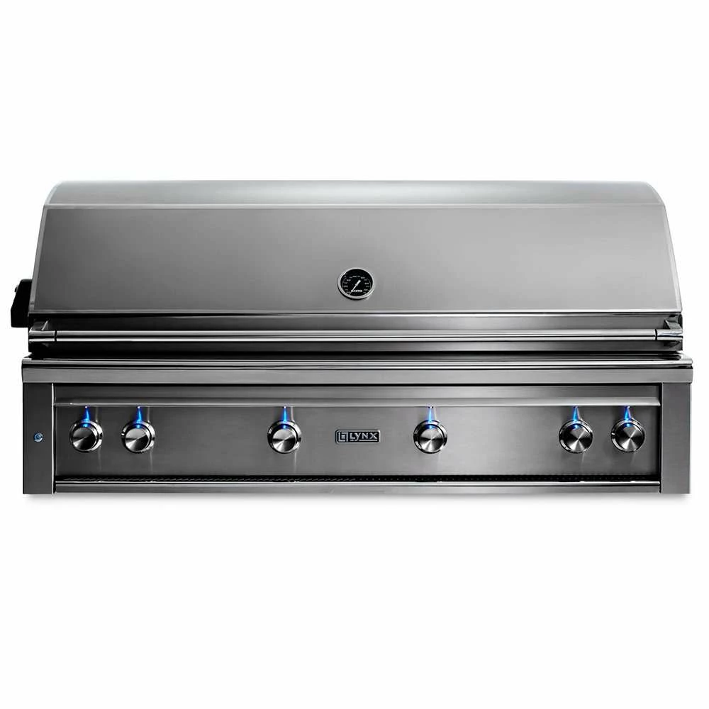Enjoy the unparalleled outdoor cooking performance with the superior craftsmanship and innovative features found in this Lynx Professional 54-Inch Grill. The quality begins outside with gleaming, high-grade 304 stainless steel that is seamlessly welded to eliminate areas where grease and moisture can collect. A patented design deflects wind and allows the grill to vent properly, stabilizing critical surface temperatures when cooking in windy conditions. Inside, a 23,000 BTU Lynx Trident adjustable infrared burner allows you to sear thick-cuts perfectly, or throttle back to cook more delicate items. Three 25,000 BTU ceramic burners deliver superior heat retention over tube burners so checking progress has minimal impact on cooking performance. The four burners push 98,000 BTUs of total cooking power on the grilling surface. An array of fixed position ceramic briquettes ensures precise, even heat distribution and an advanced ignition system uses a hot element positioned directly above the burner port to ignite the burner quickly and safely. A 1,110 square-Inch main cooking grid combines with a 445 square-Inch secondary grid for a comprehensive 1,555 square inches of overall cooking area and a large capacity smoker box allows you to add extraordinary flavor to all the things you like to grill. The Lynx Professional 54-Inch Grill also has a dual-position internal rotisserie with a heavy-duty, 3-speed motor and two rear infrared burners to raise your cooking options to their full potential. Lynx made sure you have easy access to all these fine cooking features by adding lift assist and a handle that rotates fluidly as you raise and lower the hood. Like to grill into the night? The adjustment knobs on the control panel sport blue LED accent lights for precise control and ultra-bright internal halogen lights illuminate the grilling surface eliminating guesswork. Bring the power and performance of Lynx innovation to your outdoor kitchen with the L54TR Built-in Gas Grill.