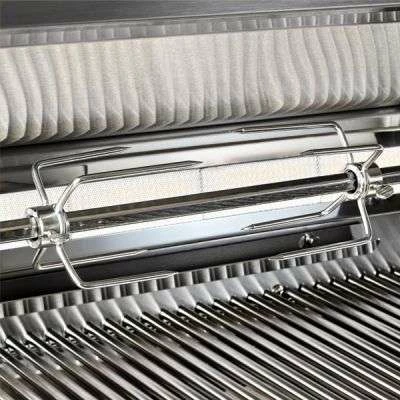 - Dual-position rotisserie internally powered by a three-speed motor, and two rear infrared burners, delivering up to 14,000 BTU each