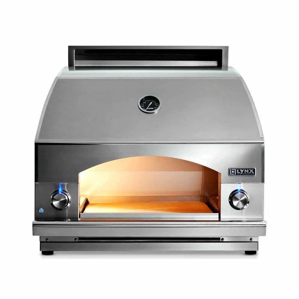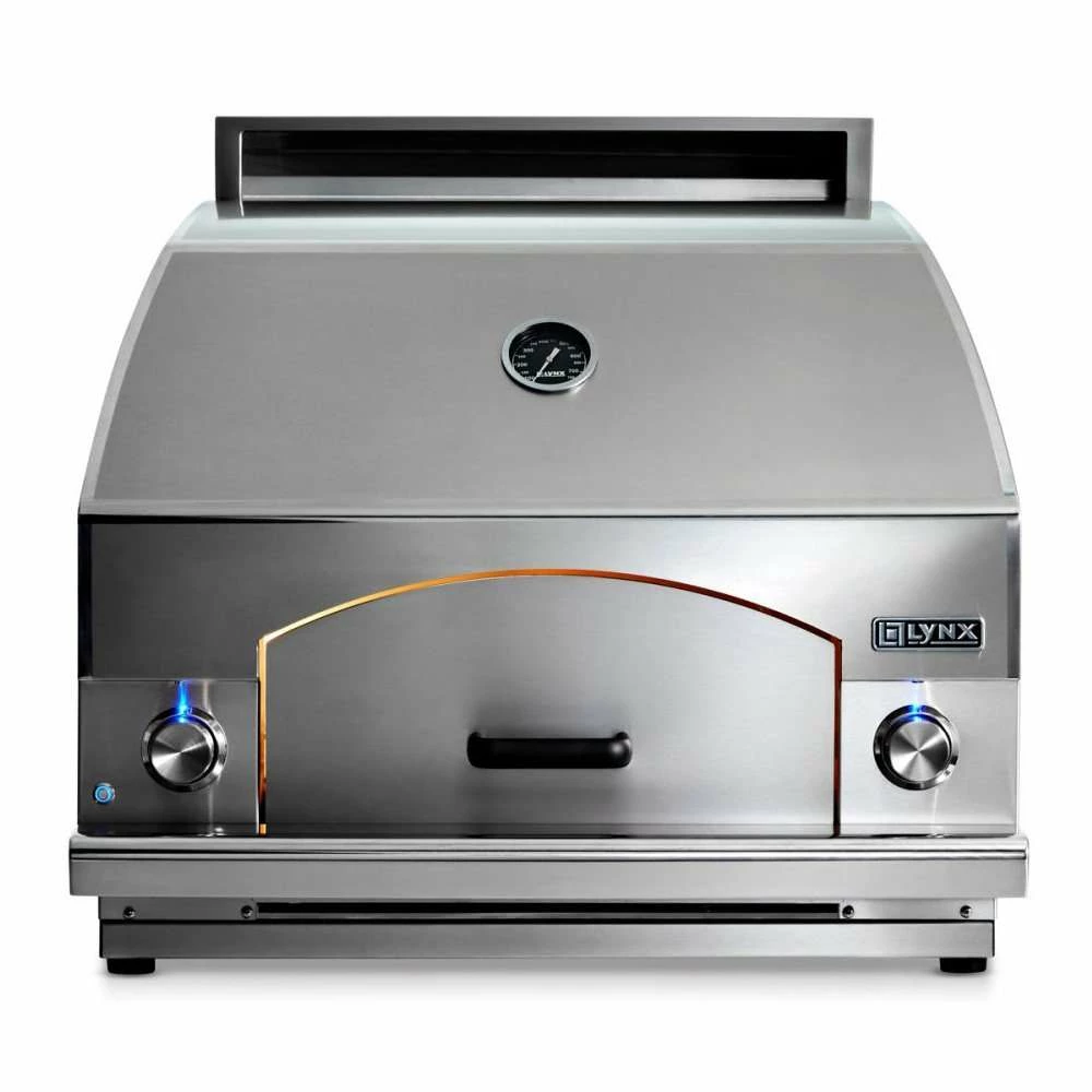 This countertop or built-in Lynx Professional Napoli Pizza Oven is the next great thing to complement your outdoor kitchen. With the capacity to bake an 18-inch pie, the inside hosts a specially formulated concrete heat-retaining dome and 400 square inch cooking surface which is perfect for the high heat demanded. The variable infrared heating system is designed to quickly preheat to 700 degrees Fahrenheit, saving energy. The front door seals the pizza oven closed, focusing the heat on the pizza. Unique in the industry, the cooking surface pulls forward for easy access to last-minute topping adjustments or pizza removal. Night-time pizza baking is no issue with blue LED control knob illumination and interior halogen light. The outside is made of stylish and sturdy stainless steel with hand-polished mirrored edges for a professional, yet fun, look. Reversible top chimney lets you control where the smoke and heat go, so as not to mar walls or bother guests. An aluminum pizza peel is included to aid in the removal of the fresh-baked pie. Endless hours of quality cooking, conversations, and fun are sure to follow when using this Napoli Pizza Oven by Lynx.