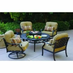 Darlee Nassau 5 Piece Cast Aluminum Patio Fire Pit Conversation Seating Set With 2 Swivel Rockers