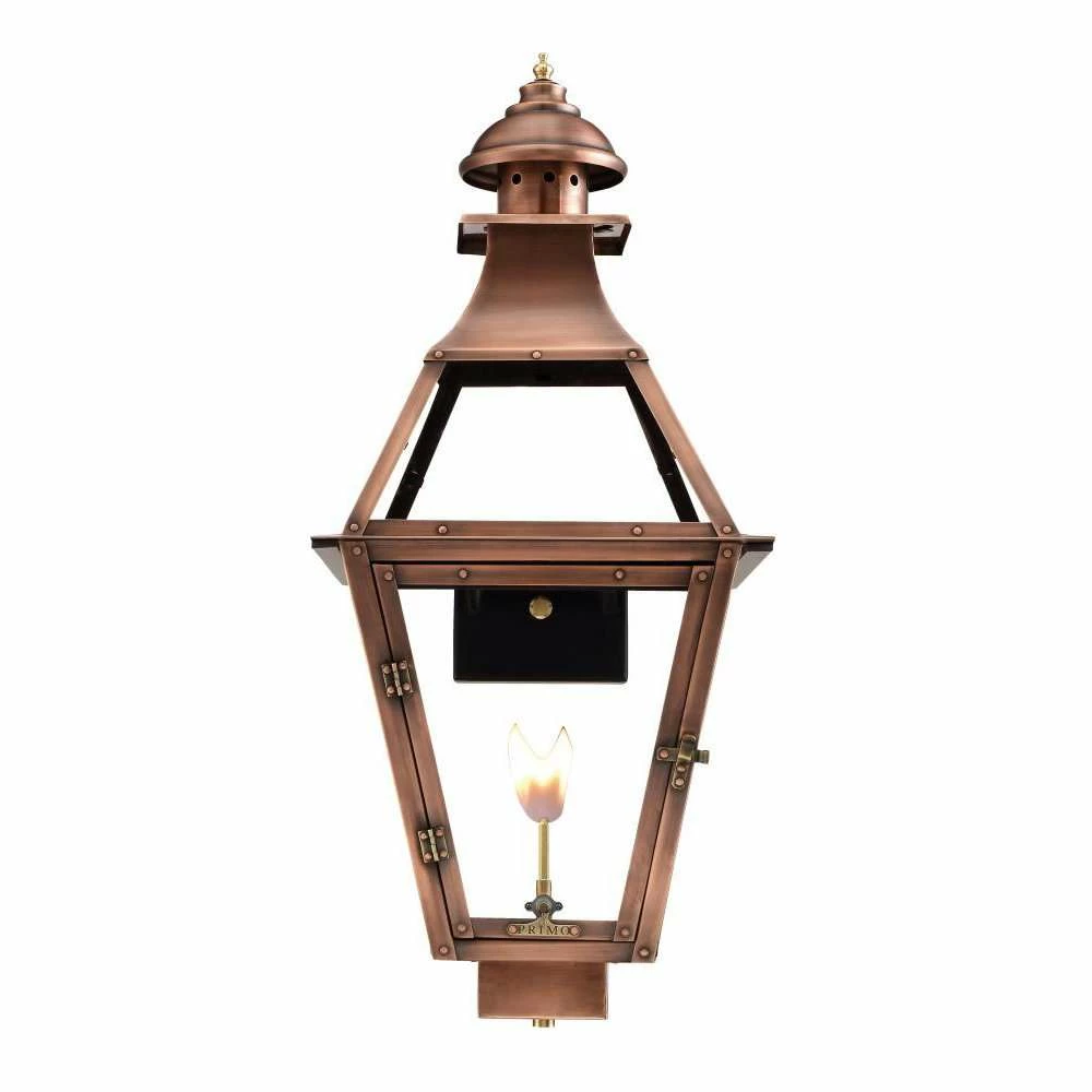Add a little Southern charm and character to any outdoor area with lighting from Primo Lanterns. Hand made from pure 22 gauge copper, the Primo Jackson 30.75-Inch Lantern is antique-finished and clear-coated for a breathtaking appearance. The warm glow of this lantern will offer relaxing illumination wherever it is located. Choose natural gas or electric power. Available with a wide variety of mounts and accessories, including: A variety of brackets and mounts, wind guards, finials, and more. Primo’s gas lantern valves are manually adjustable and burn up to 1600 BTU.