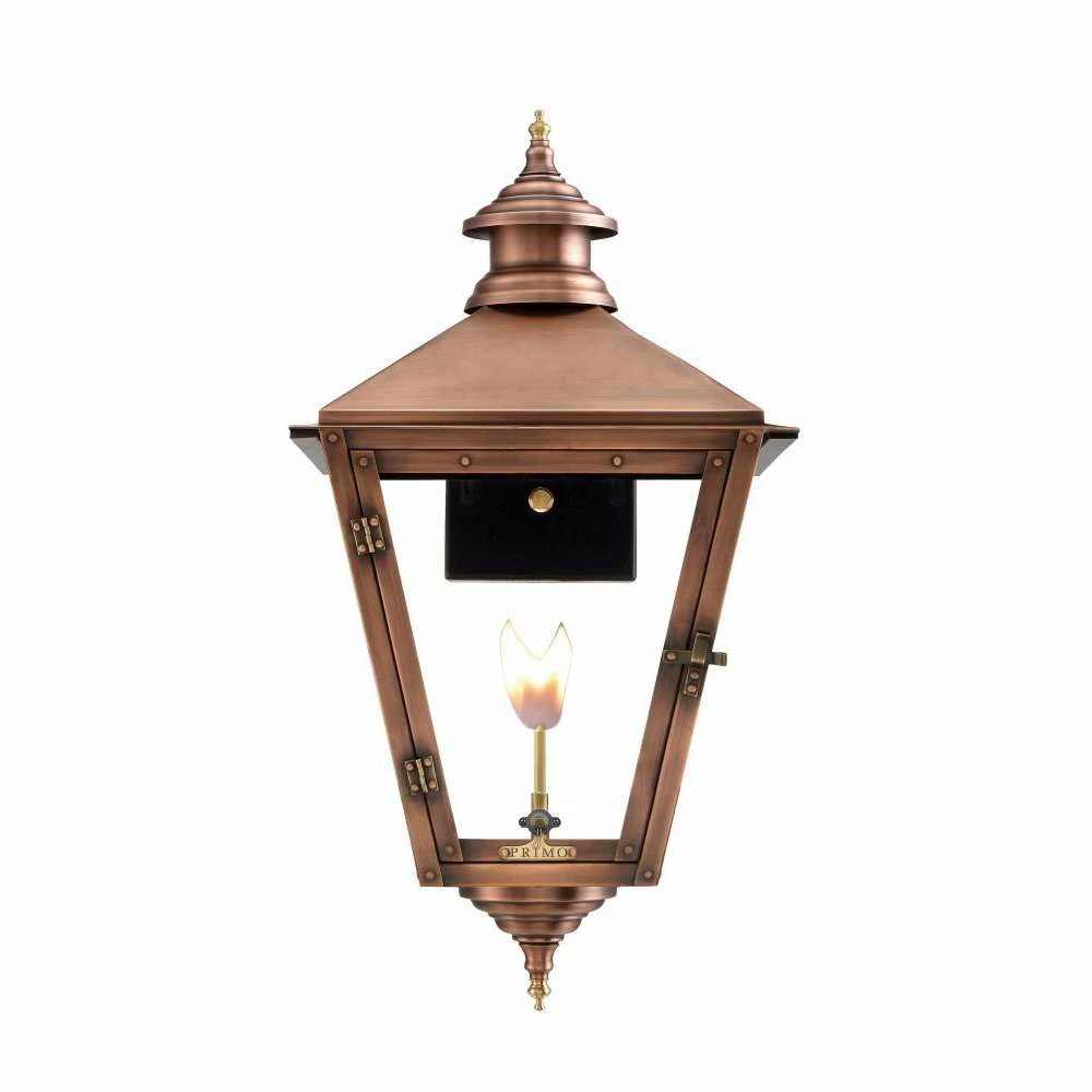 Add a little Southern charm and character to any outdoor area with lighting from Primo Lanterns. Hand made from pure 22 gauge copper, the Primo Savannah 21.5-Inch Lantern is antique-finished and clear-coated for a breathtaking appearance. The warm glow of this lantern will offer relaxing illumination wherever it is located. Choose natural gas or electric power. Available with a wide variety of mounts and accessories, including: A variety of brackets and mounts, wind guards, finials, and more. Primo’s gas lantern valves are manually adjustable and burn up to 1600 BTU.