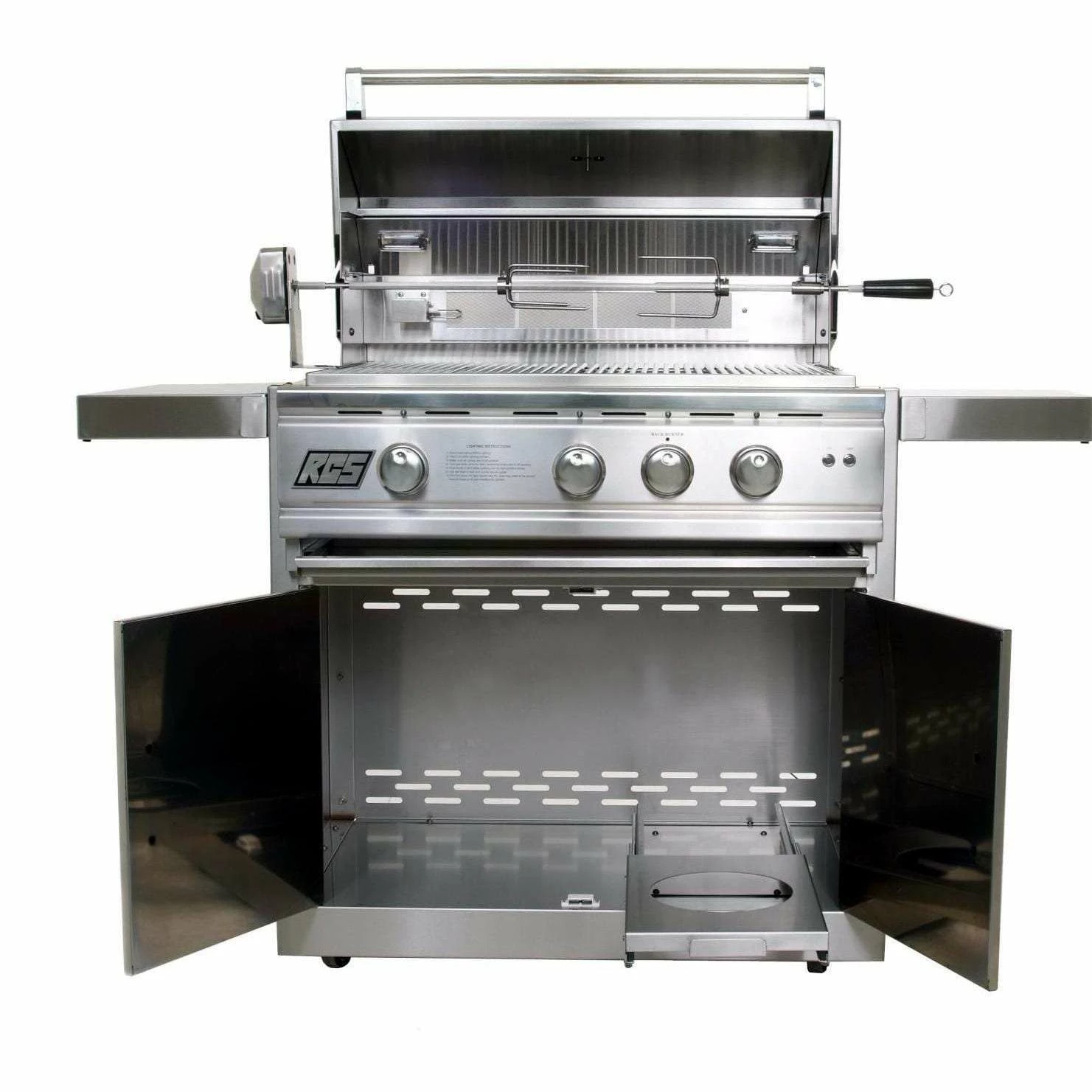 The RCS Cutlass Pro 30-Inch Propane Gas Freestanding Grill features three (3) cast stainless steel burners for 45,000 BTUs of power, plus a 20 inch stainless / ceramic rear rotisserie burner for 12,500 BTUs for a combined total of 57,500 BTUs. This grill is constructed of 304 stainless steel, making it the last grill you will ever need! This RCS grill also includes grilling zone separators that isolate specific cooking conditions to the specified grilling section. The stainless steel flame tamers prevent flare-ups for safer cooking, and heavy duty stainless steel cooking grids distribute even heat for ideal grilling conditions. Cook delicious rotisserie meals in your own backyard with the included rotisserie kit. The Sure-Strike electronic ignition system ensures an easy and reliable start-up every time. Cool blue electronic LED knob lights and interior halogen lighting provide visibility for cooking in the evening. The heat indicator installed in the hood helps you monitor cooking temperatures during your grilling experience. With a 600 square inch primary cooking area, and a 240 square inch secondary cooking area, the RCS RON30A propane gas BBQ grill on cart gives you a total of 840 square inches of grilling space. Stainless steel cart features fold-down side shelves, two doors, slide-out tank tray, all stainless steel housing and swivel casters. 62 inches wide with shelves up. Approximately 46 inches wide with shelves folded down. Cart must be fully assembled.