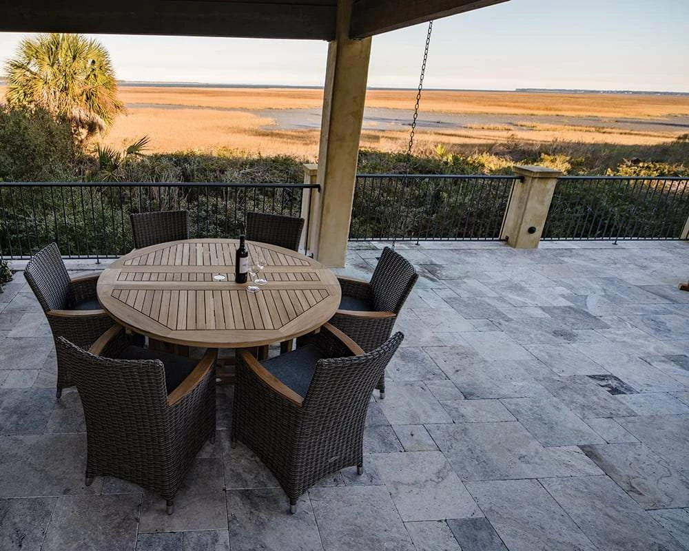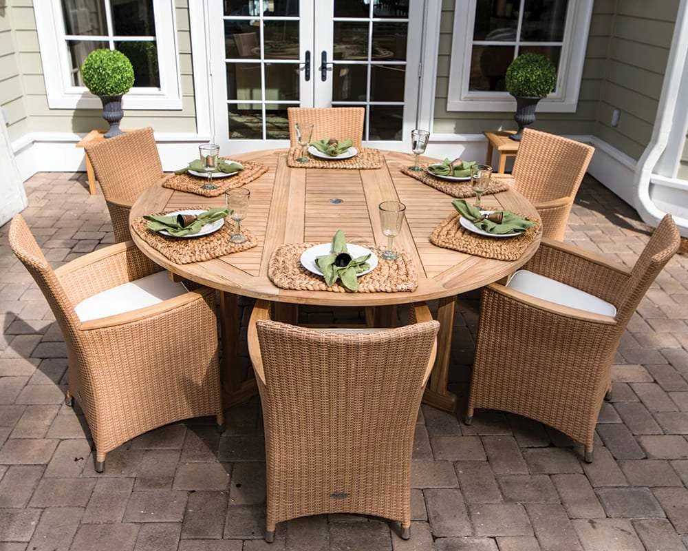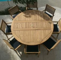 The Royal Teak Collection 6-Foot Round Drop leaf Table is kiln dried and fully machine made with mortise and tenon joints for a tight fit. Only stainless steel hardware is used, and the high content of oil in our Teak, protects the furniture from the outdoor elements, no matter what climate you might live in, and will ensure you a lifetime of enjoyment with your furniture. The Royal Teak Collection 6′ Round Dropleaf Table is designed for the customers in need of space-saving furniture and/or people with a sunroom/screened porch, where you can move the table in and out very easily. Also, the tables can be used as a half-circle buffet against a wall. 1.5″ and 2″ umbrella holes. This table’s diameter measures 72 inches across and stands 29.5 inches tall. This table pairs well with any of the Royal Teak Collection dining and Helena wicker chairs.