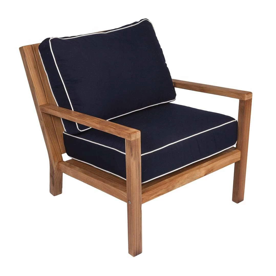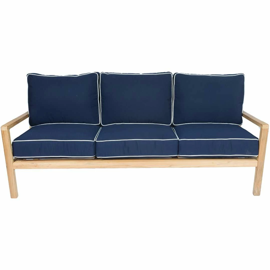 The Royal Teak Collection 7-Piece Coastal Conversation Set features a coffee table, two side tables, three-seat sofa, two chairs, and an ottoman. Deep Seating Cushions are included with the love seat and chairs and are available in four colors: Navy (shown), Natural, Spa, and Granite. Please specify what color you would prefer in the order notes. All teak pieces are kiln dried and fully machine made with mortise and tenon joints for a tight fit. Only stainless steel hardware is used, and the high content of oil in our Teak, protects the furniture from the outdoor elements, no matter what climate you might live in, and will ensure you a lifetime of enjoyment with your furniture. If left in the sun, the Teak will turn to a graceful silver appearance which looks stunning. However, you can at any time bring it back to natural by using a Teak-cleanser or by power washing it. If you choose to power wash, please use less than 2000 psi.