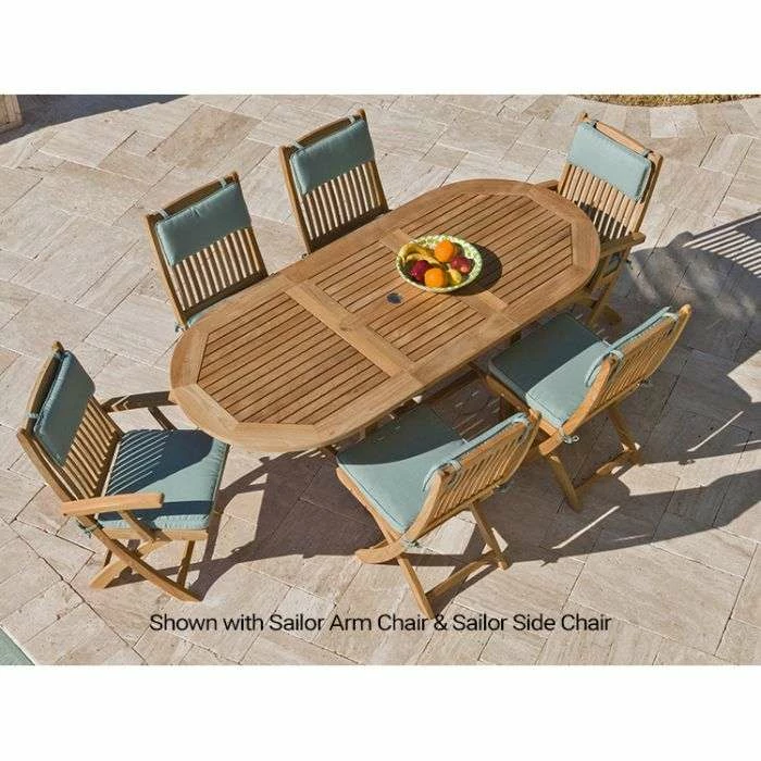 The Royal Teak 7-Piece Sailor Dining Set is kiln dried and fully machine made with mortise and tenon joints for a tight fit. Only stainless steel hardware is used, and the high content of oil in our Teak, protects the furniture from the outdoor elements, no matter what climate you might live in, and will ensure you a lifetime of enjoyment with your furniture. This dining set features an expanding dining table and six Captiva stacking sling chairs. Please specify your preference in the order notes. This set is constructed of strong, solid teak wood. If left in the sun, the Teak will turn to a graceful silver appearance which looks stunning. However, you can at any time bring it back to natural by using a Teak-cleanser or by power washing it. If you choose to power wash, please use less than 2000 psi.